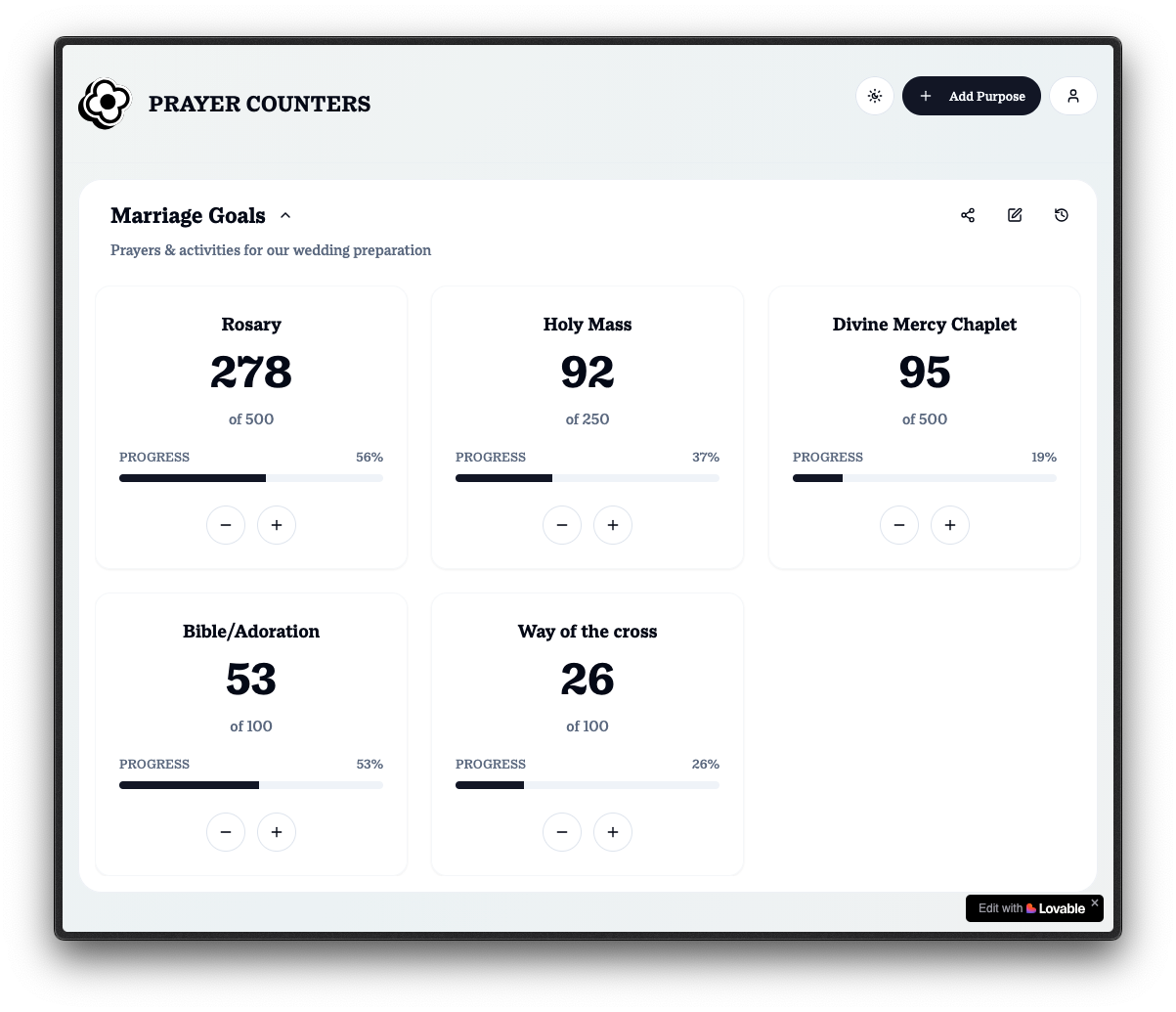 This project initiated as a prayer counter for me and my fiance to keep track of our daily prayers as we prepared for marriage. As we progressed, I saw an opportunity to enhance the experience by transforming it into a web application that not only counts prayers but also fosters a sense of community among users.